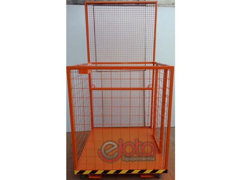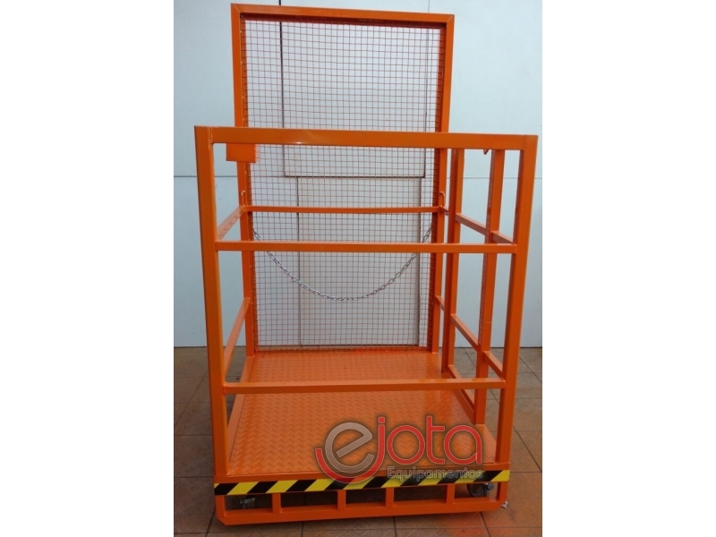 Dimensões: 1,00 m x 1,00 m (comprimento x largura) - (1m²) por 1,10m de altura mais proteção na parte traseira para impedir o contato do trabalhador com as partes móveis da empilhadeira, revestido com tela tipo ondulada, rodapé com 10 cm de altura, encaixe para os garfos ada empilhadeira proteção do lado da empilhadeira para restringir o contato com as partes móveis da empilhadeira. Possui corrente para prender o cesto na empilhadeira e sistema de ganchos para prender o cinto do funcionário ao cesto.